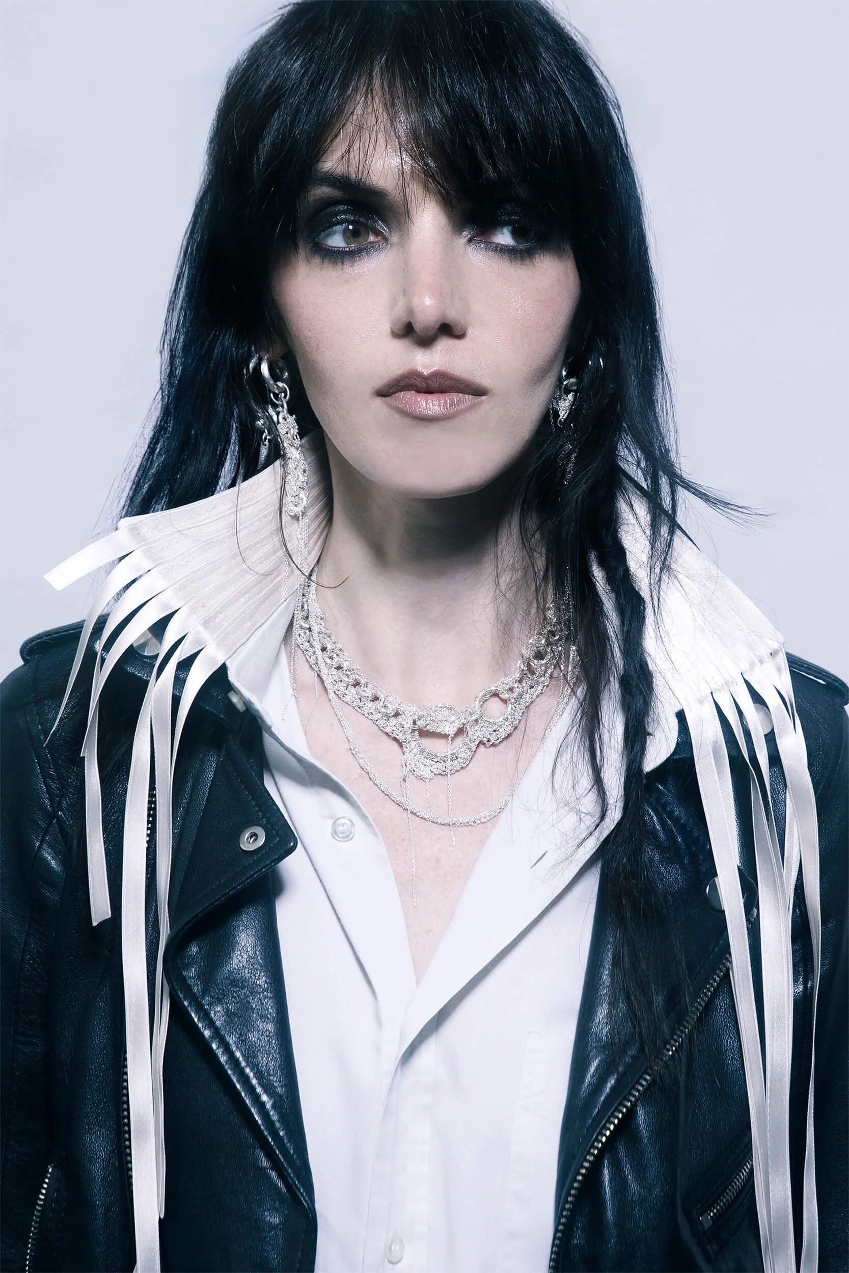 Bulky oval-link chains interlock with sculptural loops, their bold geometry softened by a delicate silver knit. This piece is crafted from an assemblage of oversized cable chains, fused with three sizes of hand-welded hoops. The structure is then gently overlaid with three different types of fine chainwork: the classic cable chain, the minimalist box chain, and the textured ball chain, together creating an intricate surface tension that radiates quiet force. The composition is completed with the 925 silver 3D-printed branded label.