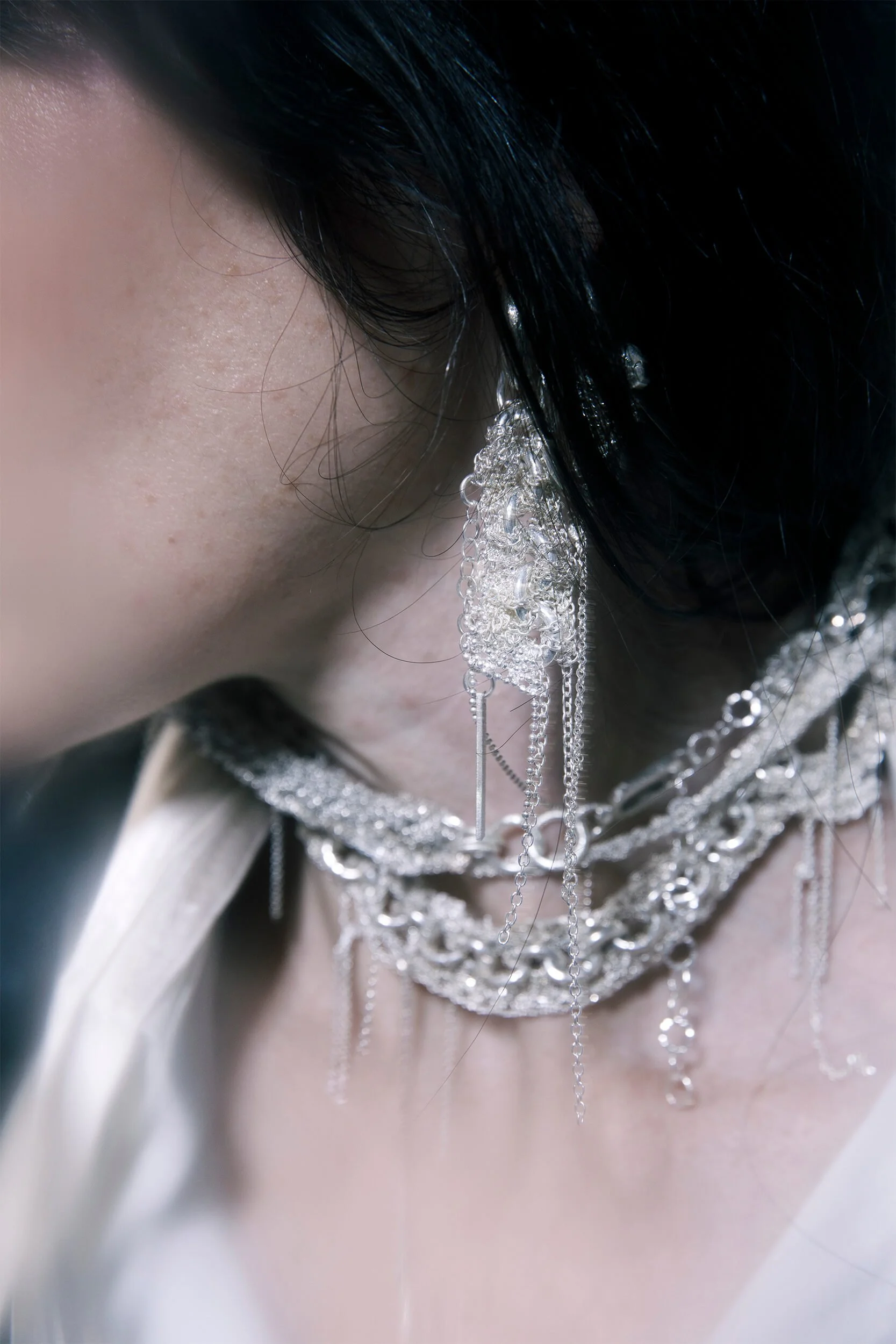 This piece is handcrafted in 925 silver. Its soft chain knit structure is inherently delicate, avoid any pulling of loose ends or exposure to tension. The silver will naturally oxidize over time, especially with contact with water, skin, or air. We recommend storing it in a dry, airtight container and gently polishing with a silver cloth when needed. For more care instructions, visit our care guide.
