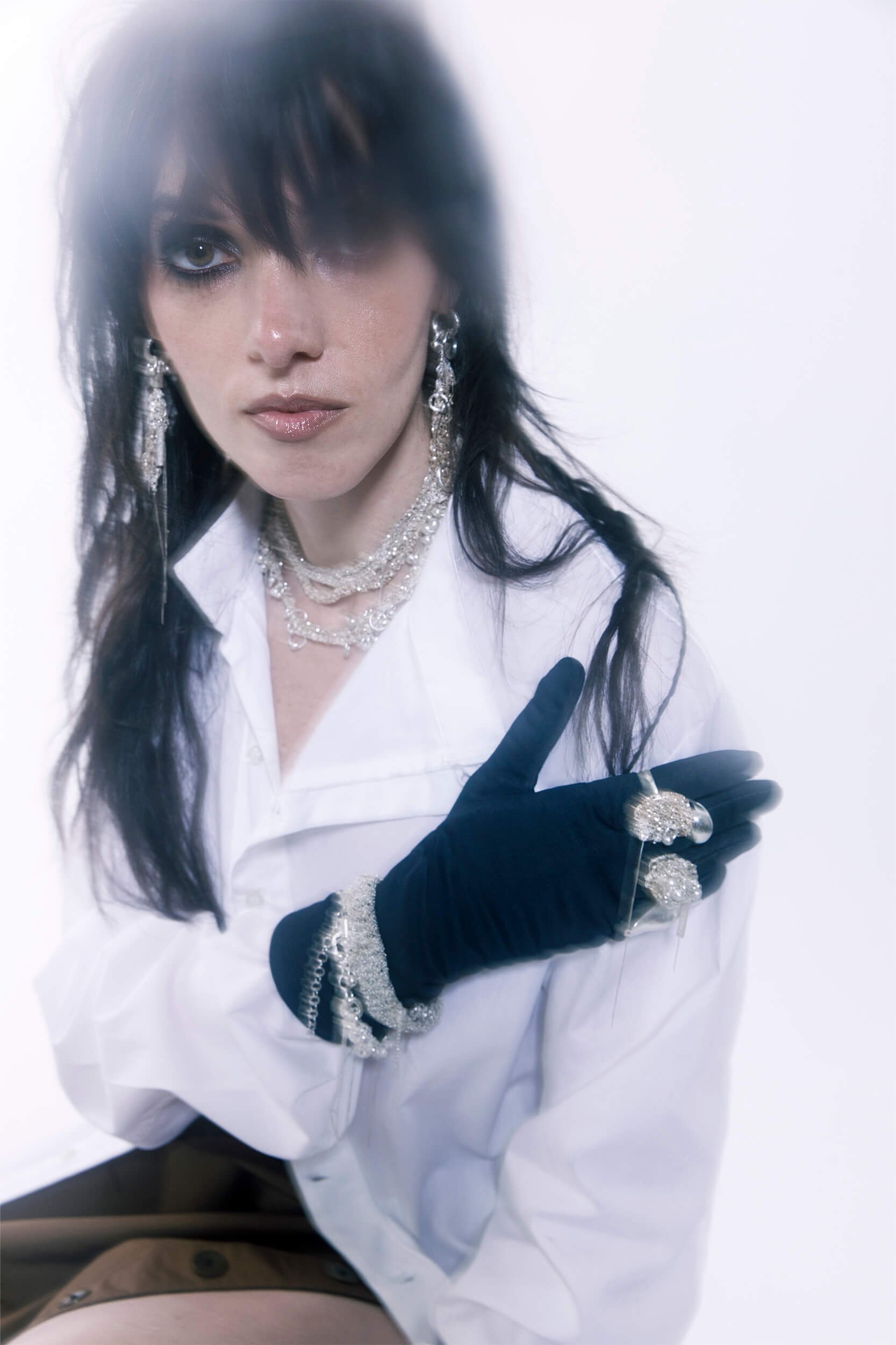 A dense weave of glistening silver,- like shattered frost preserved mid-melt. Hand-knitted entirely from 0.8mm 925 silver box chain, this piece captures tension and fluidity in equal measure. The layered structure appears fractured yet whole, like glacial cracks forged in stillness. Anchored with a sculptural oversized clasp, adjustable extension chain, and finished with a 3D-printed sterling silver branded pendant. A study in restraint and rupture. Worn close, it becomes your quiet armor.
